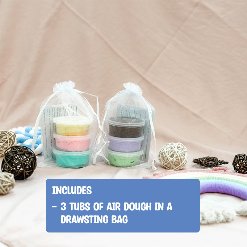 Air Dough feels softer and runnier compared to your regular Play Dough. Our Air Doughs are made of 100% natural and non-toxic ingredients, with added glycerin which hydrates your hands whilst keeping the air dough silky soft, long-lasting, and preventing the air dough from getting sticky.
