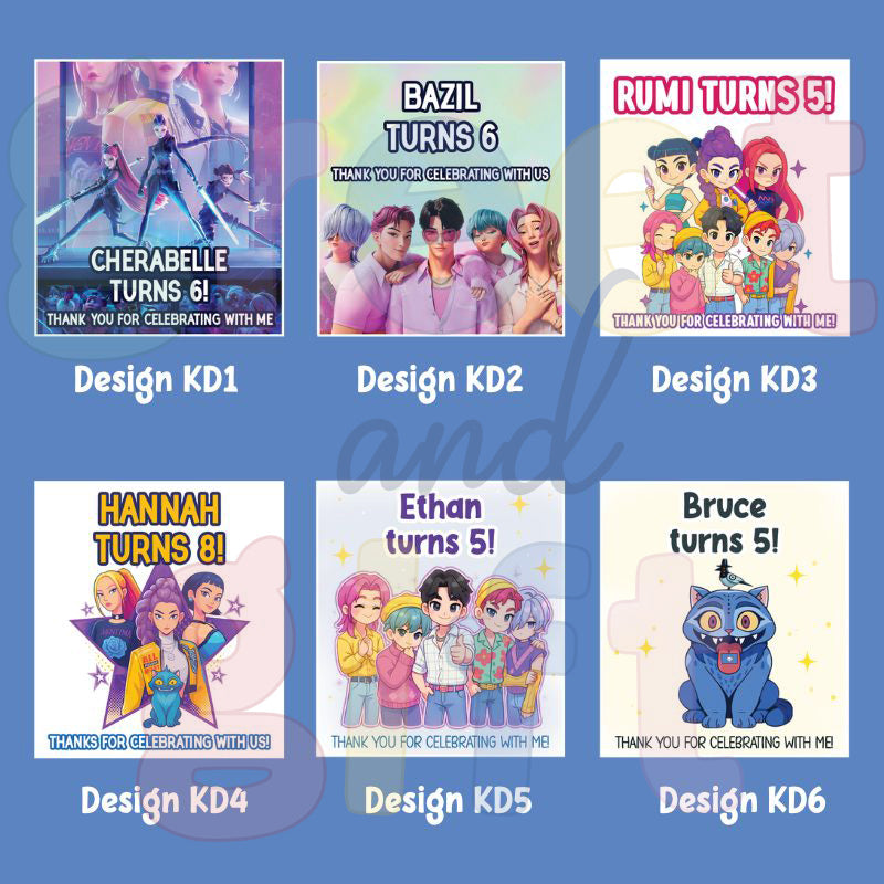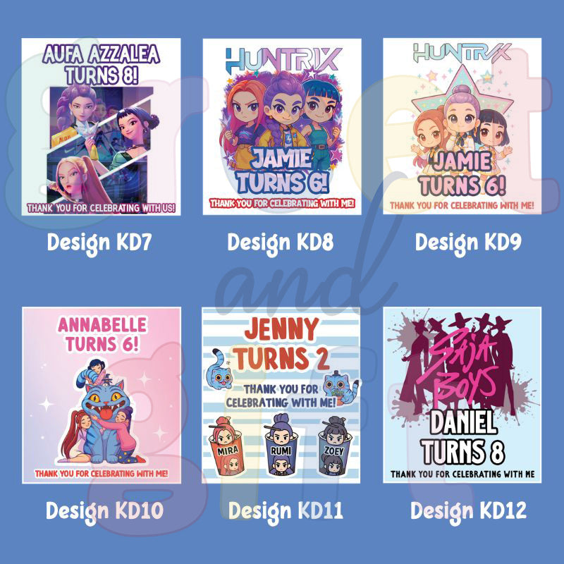 Featuring trendy K-pop Demon Hunter–inspired designs with Huntrix and Saja Boys characters, these stickers make every gift extra special. Personalise with your child’s name and age for a fun, themed look that matches your party vibe. Perfect for birthday celebrations, school events, or as adorable additions to your party favours and door gifts.